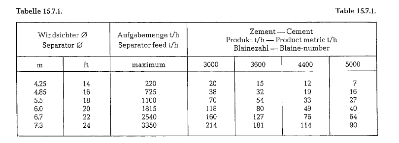 With increasing fineness of the cement, i. e. with increasing Blaine-number, the capacity of the separa tor decreases as shown in table 15.7.1. (Sturtevant Mill Company, Boston, Massachussets).