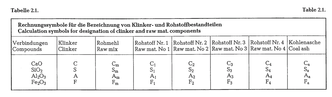 This method is applicable to two raw material components, with the hydraulic module selected for the clinker [15, 16]. To simplify the following calculations, symbols are used for the designation of the clinker components, the raw materials, and the coal ash; these symbols are placed in table 2.1.
