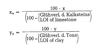 Since the oxide ·components are known from the chemical analysis of the raw materials, and the hydraulic module is selected according to the quality requirements, the only remaining unknown is x. After transformation of the above formula, to calcu late the value for x, the following formula appears: