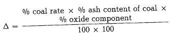The ash absorption rate can be calculated by using the analyses of the raw mix, the clinker, and the coal ash. The symbols for the particular components and oxides are the same as specified above. The rate of ash – absorption in per cent of the clinker weight is denoted by q; then we get the following equations [24]: