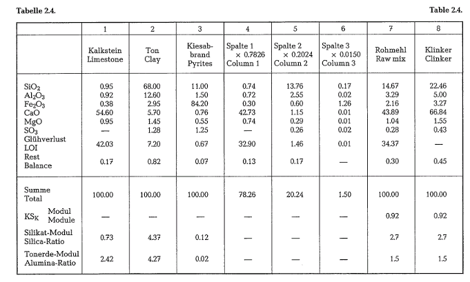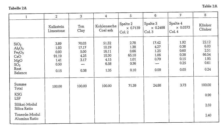 The computed chemical composition of the clinker is shown in columns 5, 6, 7, and 8, of table 2.8. As is shown by the calculation, the lime saturation factor is 0.90, i. e. as much as assumed for the calculation. This demonstrates the correctness of the calculation. For the practical completion of the proportioning of the raw materials, it is required to convert them to the unignited basis. This is performed as follows: