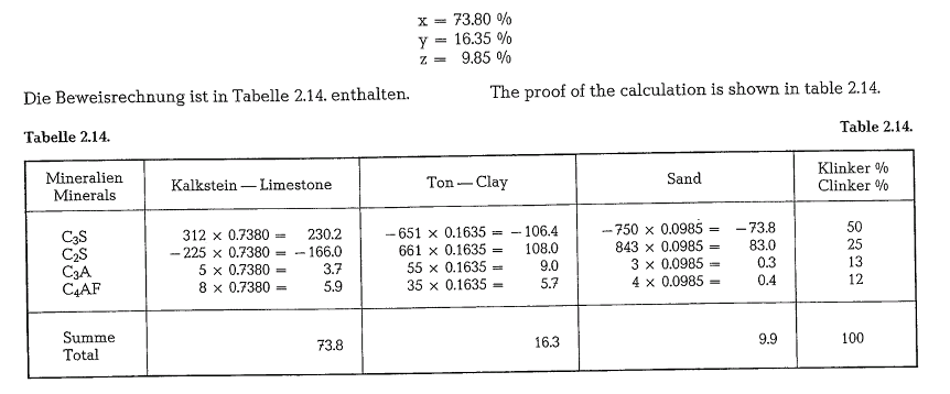 It is assumed that the ratio of the raw material com ponents is:1.component : 2. component : 3. component : 4. com ponent = x : y : z : 1; then the oxide formulas are inserted into the formulas for the lime saturation fac tor, the silica ratio, and the alumina ratio. The result ing three equations are then converted into the sim plified form of three linear equations with three un knowns; consequently we get: