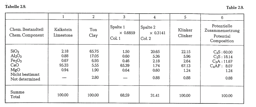 Given are two kinds of raw materials, limestone and clay, the chemical composition of which is shown in table 2.9., column 1, and 2. Columns 3, 4, 5, and 6, con tain the calculated composition of the clinker and the potential phase composition. Using the formulas in section 1.6. the four main minerals of the two raw materials, i.e. limestone and clay (ignition free), can be calculated. Table 2.10. contains the computed com position of the clinker minerals. The next step is to mix the limestone and clay in such a ratio that the blend of both components will result in the required content of tricalcium silicate, C3S, of 60% [12].