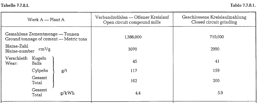 Since about 1955, a considerable reduction in the wear of grinding media has been achieved, due to the selection of proper alloys. Table 7.7.2.1. shows the improvement in the specific wear rate of grinding media in finish grinding mills, during the period from 1958 to 1971, relating to grinding of standard cement (Type I)