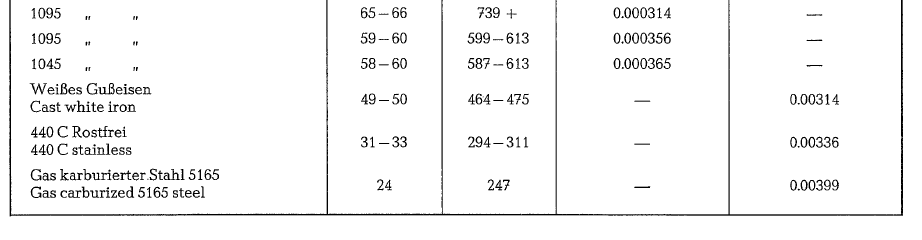 Independent of the chrome-content of the grinding balls, the specific wear rate of the grinding media var ies approximately from 15-110 grams per ton of cement. This depends on the different tempering pro cess of the grinding media. Table 7.7.3.1. contains a compilation of wear rates of grinding media with 59 Rc hardness (comparable approximately to 600 BHN), as exemplified by four different manufac turers [78].