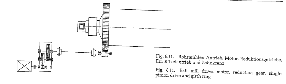 Concerning the efficiency of the ball mill drives, i. e. trunnion connected drive (TCD) versus gear and pinion drive (GP), it can be said that as yet there is no definite evidence indicating the superiority of one kind of drive compared to the other. For comparable mills, both drives can show efficiencies of 98 or 97 %, depending upon the design configurations of both types of drives. However, from a comparision of investment costs for the same mill size, results show that the TCD arrangement is 50- 60 % higher in price than the GP drive. This refers to U.S. price con ditions. According to Schroebler [84], this price differ ence is even much higher. On the other hand, Ackle says that central drives are only 5- 20 % higher in price than gear and pinion drives. Presently it is possible to transmit energies of more than 3000 kW with gear and single pinion drive [84, 85, 86]. Recently, KHD Humboldt Wedag AG constructed a tube mill with gear and double pinion drive with a power input of 6700 kW (about 9000 HP) .