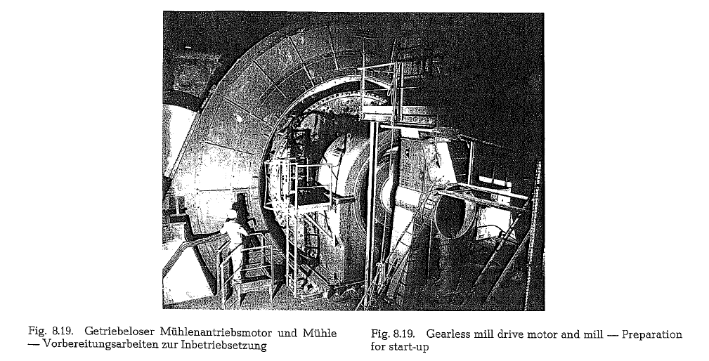 About 36 ball mills with gearless drives are already in operation or ordered at this writing (1984) – the majority with wraparound motor construction (Fig. 8.14.), and the remainder with the motor arranged as shown in Fig. 8.13.