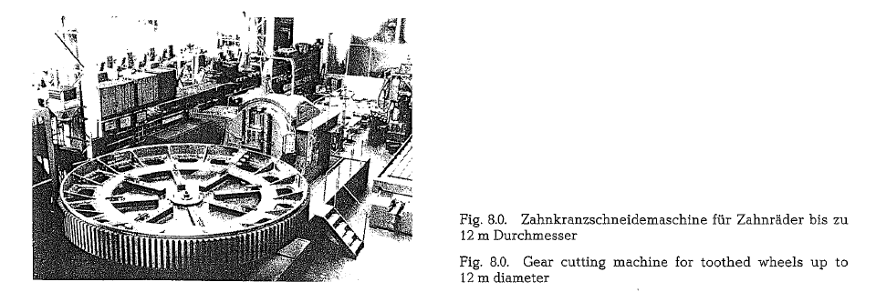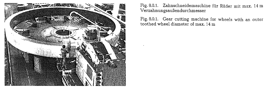 Fig. 8.0.1. shows a protracted version of the 12m MAAG gear cutting machine with an enlarged outer tooth wheel diameter range of up to 14m, which by the end of 1982 was supplied to the David Brown Co. in South Africa [87a]. This is up to now the largest gear cutting machine of the world, and satisfies among others all requirements concerning mill and kiln drives of the cement industry for the next future. Fig. 8.0. and 8.0.1. are from MAAG-Zurich.