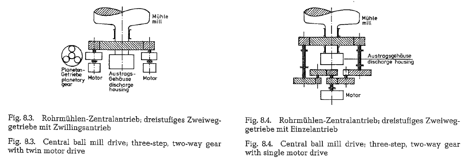 The following four schematic illustrations show var ious modifications of central ball mill drives [87].