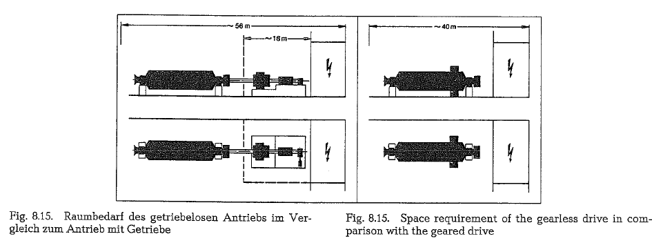 The gearless mill drive allows a more flexible layout of the mill room, since the mill drive is not mechani cally connected to the mill. The space requirement of the gearless drive (Fig. 8.15. right) is about 16m shorter in comparison with the geared drive (left). This results in large space savings. The space saving applies to drive motors up to about 6.5 MW