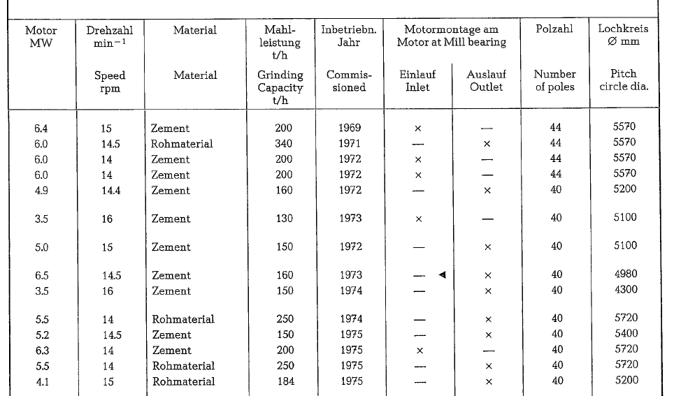 Table 8.3.1. lists the most important data of the ball mills worldwide which are driven by ring motors