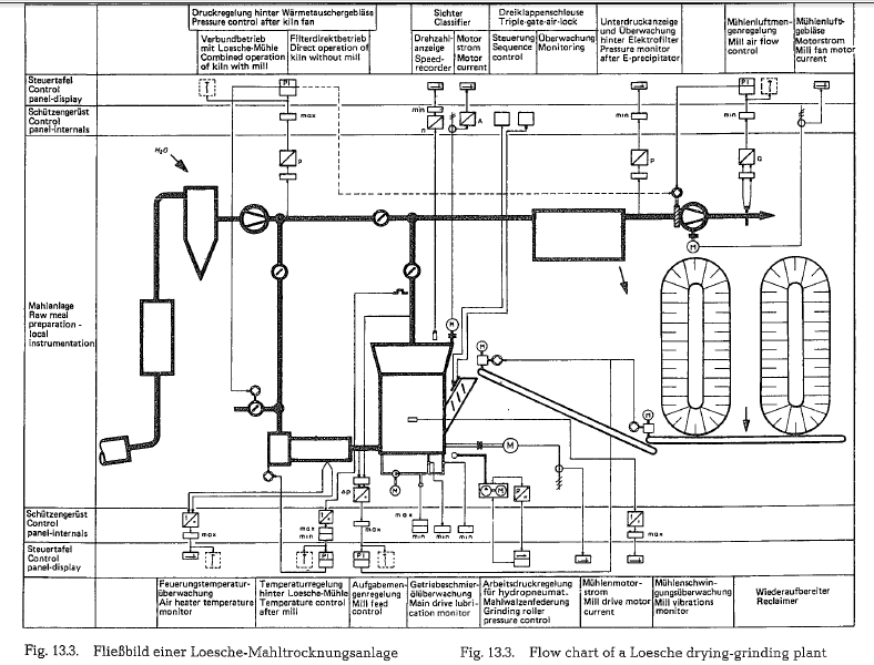 Fig. 13.3. shows a flow chart of a Loesche-mill for drying-grinding of cement raw material. applying exit gases from a preheater kiln. Besides regular operation, at which the kiln exit gases pass the mill, and, if necessary, are boosted by an air heater, this arrange ment allows the gases to bypass the mill, and to enter the dust collector, after cooling in a spray tower. There are separate control loops for various operat ing conditions.