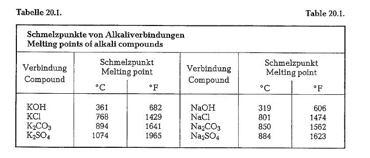 Above approximately, 800 oc the alkalies in the kiln start to volatilize. Table 20.1. contains melting points of various alkali compounds.