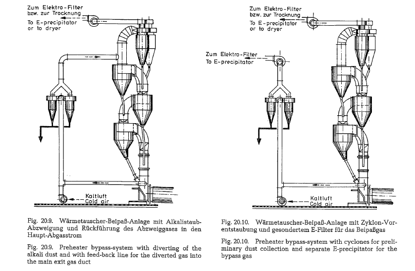 Fig. 20.9. presents a preheater bypass arrangement where the alkali laden dust of the bypass gas is separ ated in cyclones; the cleaned gas is then reunited with the main gas stream. The alkali laden bypass dust is usually either discarded or leached.