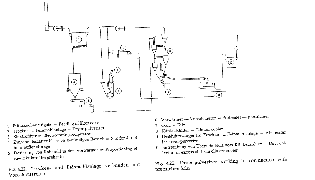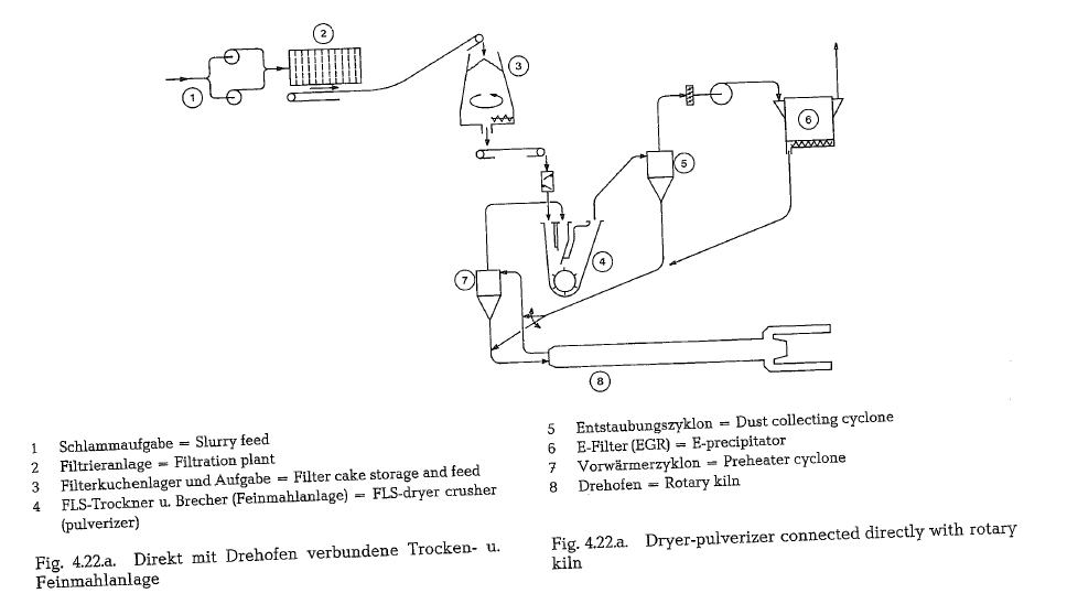The flow chart in Fig. 4.22.a. shows a process, whereby the filter cake is fed directly into a dryer-pulverizer arrangement in which the filter cake is dried by the hot exit gases from a one- or two-stage preheater kiln.