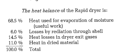 This shows that the heat efficiency of the rapid dryer is 68.5 %. This applies to 20% moisture in the dryer feed.