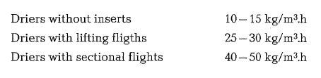 The work of a drum dryer is characterized by the specific rate of evaporation; this is the evaporated amount of water in kg per hour per 1 m3 of cylinder volume. This figure is also designated as intensity of evaporation; this intensity depends on the physical properties of the material, its particle size, the kind of moisture, the initial and final moisture content, the temperature of the flue gases, as well as on the design features of the dryer.