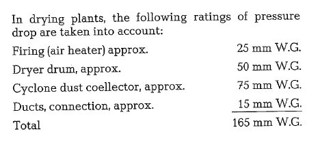 The pressure drop of drum dryers depends upon the length and diameter of the cylinder, the kind of built-in flights, the rate of hold-up, the speed of rotation, etc. For the cylinders as such, 35-75 mm of water gage are taken into account. Grate firing has a pressure drop of 45- 60 mm W.G.