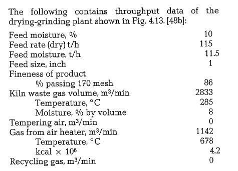 Table 4.10.1. contains data on the specific heat con sumption for drying of cement raw materials at exit gas temperatures above 100 C. These figures can be used as a basis for sizing drum dryers [47b].
