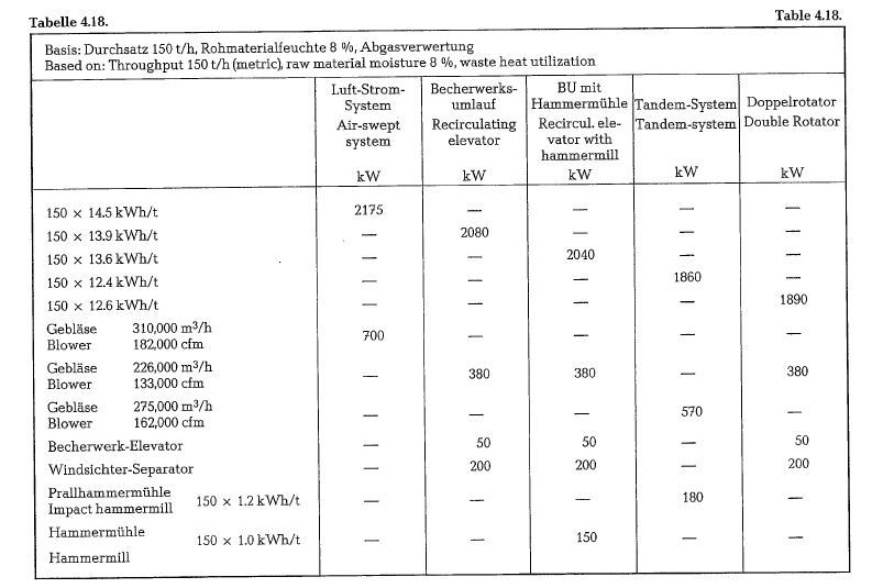 Based on the specific power requirement alone, it is quite impossible to say which of the drying-grinding systems enumerated in the tabulation is the most efficient one, since for a comparative rating a number of other influential factors as e.g. investment cost, operating cost etc., should be taken into consideration.