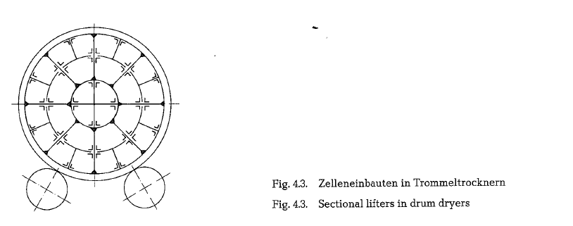 Sectional lifters as shown in Fig. 4.3., divide the cross-section of the dryer cylinder into several sec tors. This prevents the free fall of the dryer feed and, by frequent turn over, insures a thorough contact with the hot gases. Sectional lifters cause less dusting.