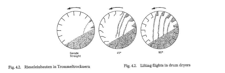 These built-in flights cause almost the entire crosssectional area of the dryer drum to be filled with free falling dryer feed in order to achieve repeated and thorough contact with the dryer gases. Lifter flights are used for drying of plastic materials, since these installations decrease the tendency to stick. These kinds of installations sometimes cause a higher rate of dusting. The working of the straight, 45 deg. and 90 deg. bent lifters is shown in Fig. 4.2. Straight lifter flights are used rather at the feed end of the dryer for sticky and wet materials, whereas 45 deg. and 90 deg. bent lifter flights are used for free flowing or less moist materials.