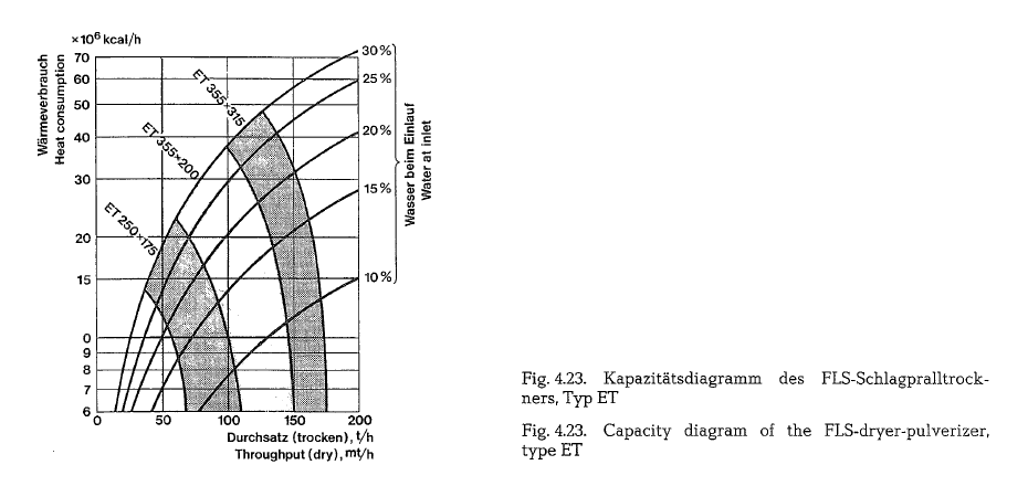 Fig. 4.23. shows a capacity diagram of FLS-dryer-pul verizers, type ET. The shaded area of the diagram shows the range of application of three different construction sizes of the ET-dryer-pulverizer. The right side of the diagram denotes the moisture content of the raw material at the inlet of the dryer-pulverizer; the left side designates the required heat in kcal/h, when drying to a final moisture of 3 % with a gas temperature of 800 o C, and the abscissa indicates the throughput in metric tons/h, referred to the dry substance [87c].
