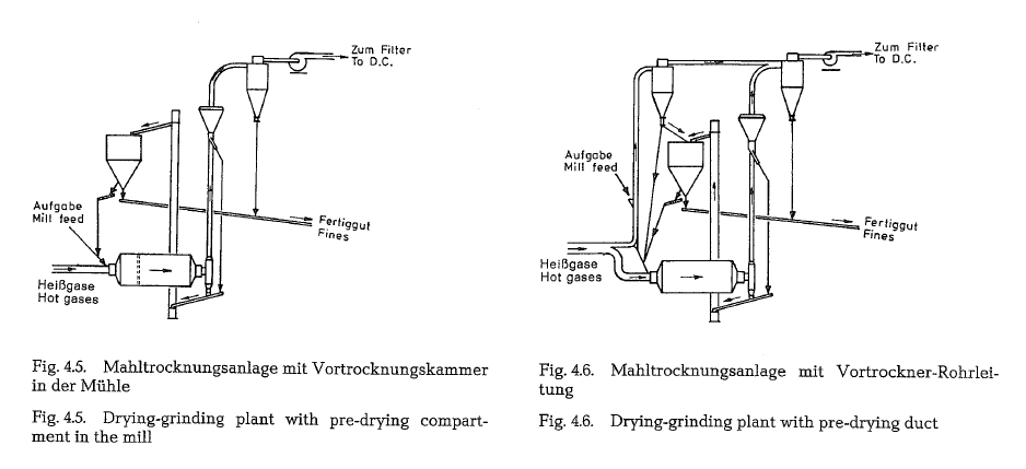 The characteristic feature of the drying-grinding process is that two different processes are generally per formed in the grinding mill. Frequently, auxiliary equipment of the grinding circuit is also employed in the drying procedure, to increase the drying efficiency. The heat consuming items are approximately the same as specified in the chapter concerning drum dryers.