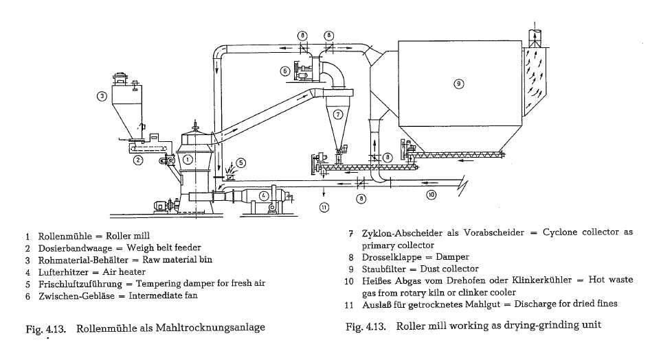 Roller, or bowl-type mills (Loesche-mill, MPS-mill, Atox-mill, Polysius-mill, etc.) are mainly employed in drying-grinding circuits. Roller-mills are described in chapter 13 of this book. Fig. 4.13. shows the operating flow chart of a roller mill working as a drying-grinding unit.