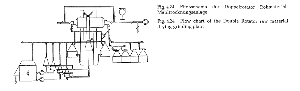 The flow-chart shown in Fig. 4.24., portrays a Polysius drying-grinding arrangement, called Double Rotator, supplied with a predrying compartment. The raw material or tailings as well as the hot gases are fed into the mill from both ends; both media exit through the center discharge arrangement.