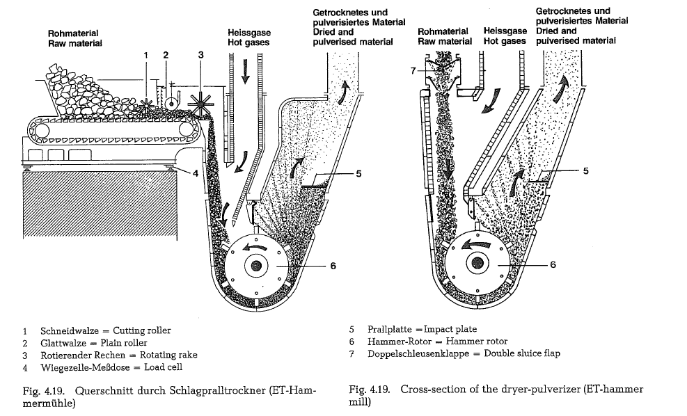 The Bernutat Company, Krefeld, W. Germany, has also erected drying-grinding plants with throughput capacities up to 200 metric t/h. Drying-grinding plants working in conjunction with hammer mills with capacities up to 360 t/h, have been erected by the Orenstein u. Koppel Co. (W. Germany). Basic features of drying-grinding plants were already described in 1938 by N.C. Rockwood in the technical magazine Rock Products [50a].