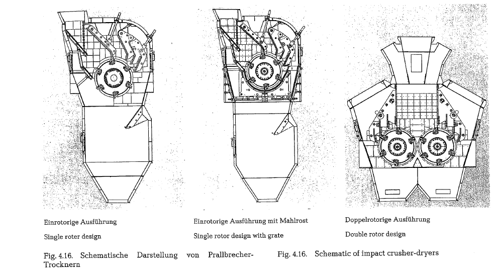 Fig. 4.16. shows a scheme of three impact crushers with drying arrangements. Table 4.17. contains capacity figures for impact crusher-dryers (manufacturer: Hazemag, Munster, Westfalen, Germany).