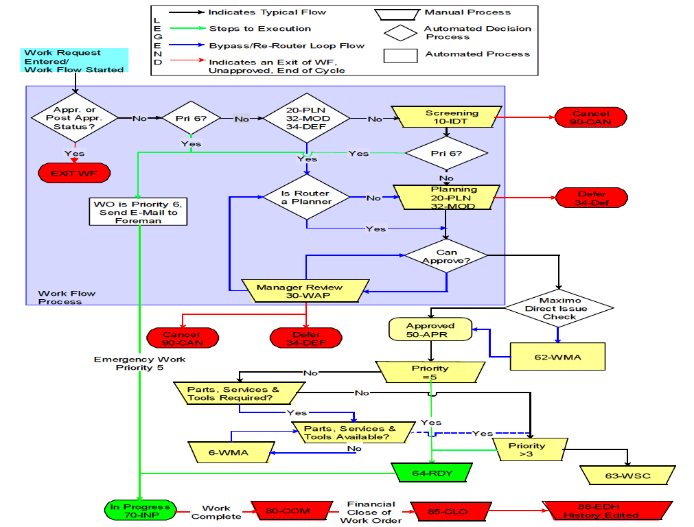 CMMS software implementation was done to determine the plant asset reliability impact and the plant KPIs. The software deployed is Maximo 7.0 software. The implementation involved provision of desk top computers to maintenance personnel, inspectors, planners and executioners. The software was installed on the computers and networked to the server. When an inspector observed a fault or malfunctioning of a machine, a work order was raised, approved by Methods Engineer and sent to respective executioner. When the fault is rectified, it was reported back and approved by Mechanical Manager. The overall plant reporting was done through plants key performance indices calculation. Reliability Factor (RF), Utilization Factor (UF), Performance Factor (PF), Number of Stoppages for Incidents (NSI), Inspection Compliance (IC), Planning Efficiency (PE), Scheduling Compliance (SC), Execution Number of Re-works (ENR) and Mean Time Between Failure (MTBF) were collated on monthly basis between 2013 and 2015. Figure 1 shows the flow chart for the step-by-step procedure adapting and applying the software to cement production factory environment.