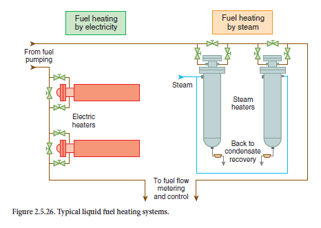 • Essentially, there are two configurations for heating systems, both introduced in Figure 2.5.26; they are, 1) an electric heating system, that uses electric resistance to increase the temperature of the liquid fuel flow, and 2) steam heating system that uses a surface heat exchanger with steam as the high temperature fluid to increase the temperature of the liquid fuel flow.