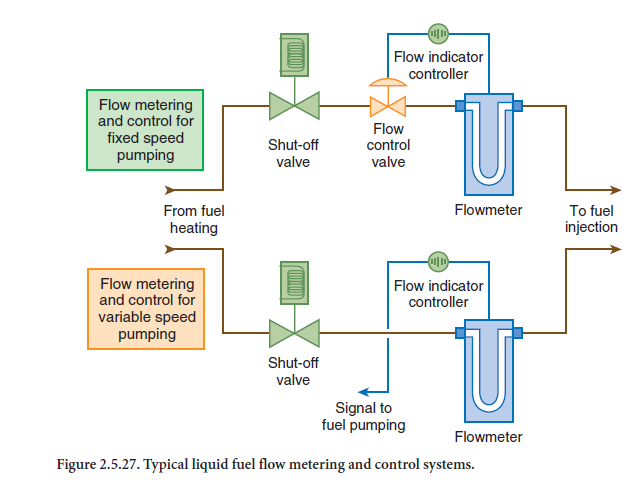 Flow control and metering. Essentially, there are two systems for flow control and metering of liquid fuels. They are schematically shown in Figure 2.5.27, each compatible with either one or another of the typical pumping systems used in cement plants. The following remarks apply to flow control and metering systems: