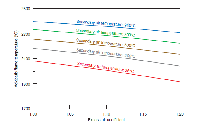 A physical characteristic that is always assessed whenever selecting a fuel for a specific purpose is the “adiabatic temperature of the flame.” It is defined as a temperature of the products of combus-tion in a full, adiabatic firing process – i.e., without any heat exchange with the environment – and under constant pressure, applying an oxidant in a quantity at least equal to the stoichiometric requirement. The last part of the definition – “applying an oxidant in a quantity at least equal to the stoichiometric”- shows clearly that the adiabatic temperature of the flame is not a thermody-namic property of the fuel; the same kind of fuel fired with the same oxidant, such as atmospheric air, will show a lower flame adiabatic temperature, when excess air is available. A fuel fired under the stoichiometric volume of air will show an adiabatic temperature that is higher, the more enriched with oxygen the air is.