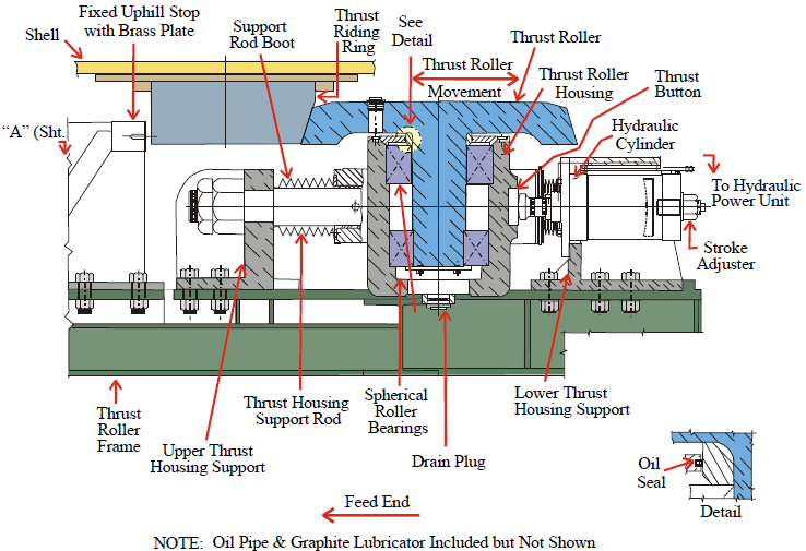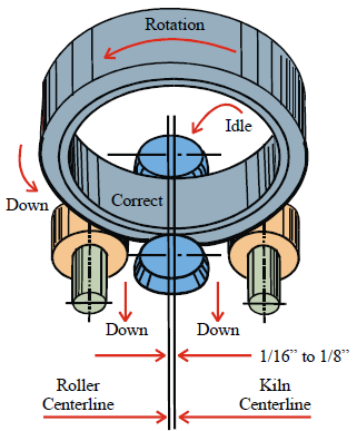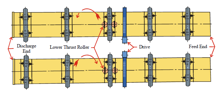 With a two thrust roller system (as here) the kiln should be floating between the thrust rollers.