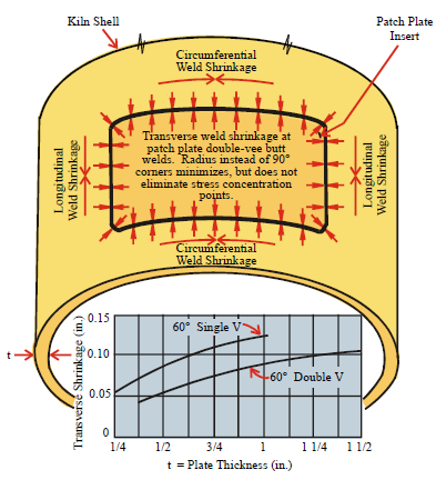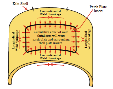 In actual installation and welding of shell patch plates and other inserts, limited shell plate movement is possible but combined weld shrinkage stress forces warp the surfaces within and around the patch plate or “add-on” fixture. Base metal at the welds is not far from the yield point after welding.