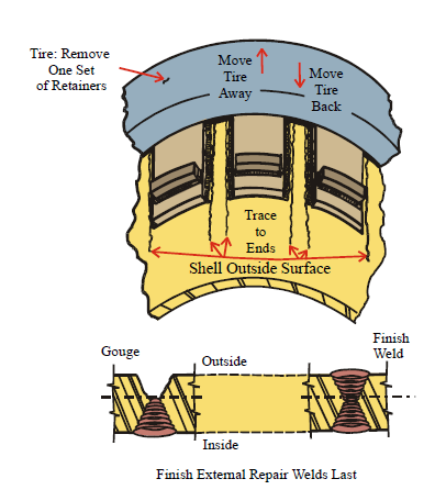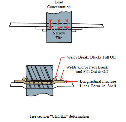 Thin tires and excess clearance contribute to shell ovality and fracture at pad welds or in shell plate