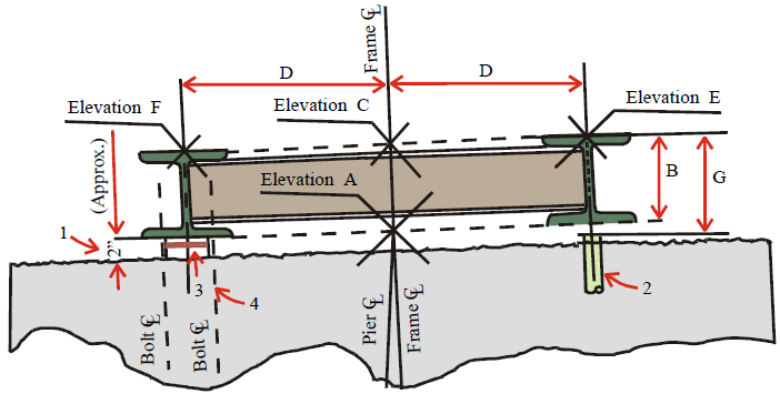 2 – Elevation reference plug. Set in pier on beam-web CL. Locate plug 6” outward from end of beam.