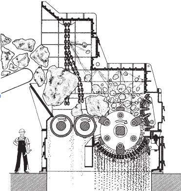 • Impact hammer mills. In this variant (Figure 2.3.11), the feed material enters the crusher from the left and is transported toward the hammer rotor by slowly rotating one or two shock-absorbing inlet rollers to avoid jamming and to ensure precise feed control. The hammers rotate clockwise. When they hit the feed material from below, fragments are thrown against the breaker plates and the inside casing, where secondary crushing takes place. The final crushing is performed between the hammers and the outlet grate.