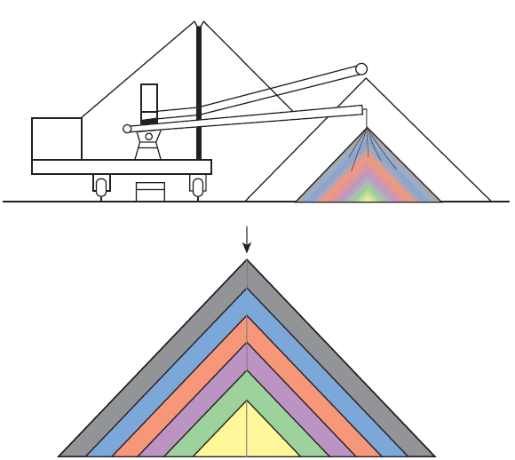 Gyratory crushers (Figure 2.3.5) are very commonly used for primary size reduction of hard ore. They are also used for secondary and tertiary crushing in the form of standard cone or shorthead crushers that provides a continuous compression action. In the gyratory crusher, a cast conical head or mantle gyrates with an eccentric motion inside a cone-type crushing chamber. At any given point in the cavity, the crushing action comes from a reciprocating compressive motion. However, considering the whole crushing chamber, it turns out to be a continuous compressive action. When used for primary or coarse secondary crushing, these crushers are usually fitted with straight face concaves and a steep sided crushing cavity with a single angle of nip of 26 to 28°. With these types of concaves, the receiving opening is at a maximum. When the maximum capacity and the maximum reduction ratio are required, rather than the maximum feed opening, curved or non-choking concaves are used. The length of the crushing stone is also an important factor as it has significant effect on the capacity and screen analysis of the crushed product. A short stroke may yield evenly crushed product but at a reduced capacity.