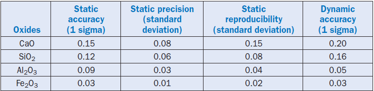 In Table 2.3.11, the static accuracy means the accuracy of calibration, where the Imacon analysis with 4-minute measurement time is compared with the analysis of the same samples by a state-of-the-art laboratory wavelength dispersive XRF spectrometer. The static precision test usually refers to the standard deviation of the 10-30 measurements of the same sample without removing the sample from the cell. The static reproducibility test is the same as the previous one, with the differ-ence that the sample is taken out of the cell and reintroduced for measurements. The dynamic accuracy is a comparison of the Imacon individual 4-minute analysis value of a sample with the analysis of the same sample by a wavelength-dispersive XRF instrument.
