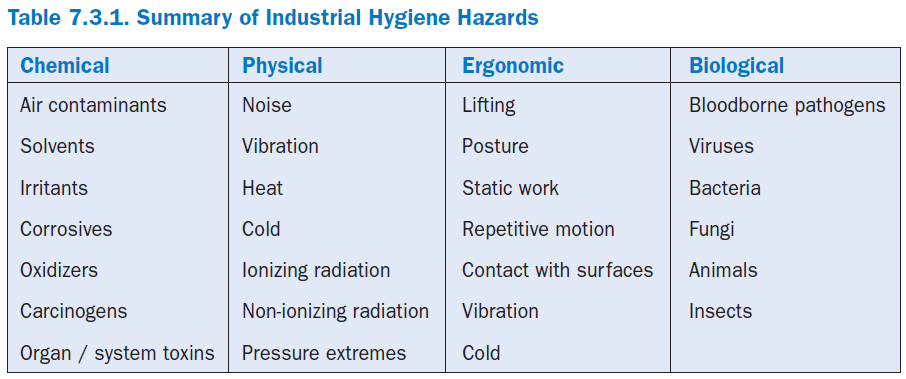 Due to the nature of the cement manufacturing process, the industry has its own set of unique IH hazards that should be recognized and controlled before they become harmful. These hazards can be divided into four main categories: 1) chemical hazards that can be irritating or toxic to the body’s organs or systems, 2) physical hazards, such as noise, vibration, radiation, and thermal or pressure extremes, 3) ergonomic stresses resulting from an improper interface of workers and workplace machines, tools and procedures that repetitively stress vulnerable areas of the body, and 4) biological hazards from living organisms that can adversely affect bodily functions. See Table 7.3.1.