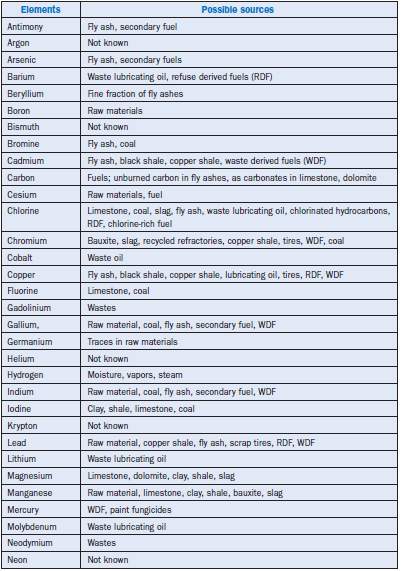 Minor elements are derived from the raw materials and fuels used in cement manufacture, for example, limestone, clay/shale, and coal. They also come from widely used auxiliary materials such as blast furnace slag, fly ash, iron oxide, bauxite, and spent catalysts. A secondary but important source of minor elements is the industrial wastes that are used for supplementation of the primary fuel. These include petroleum coke, used tires, impregnated sawdust, waste oils, lubricants, sewage sludge, metal cutting fluids, and waste solvents.