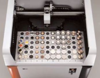 Powders are pressed into a sample holder and a flat surface created that will be exposed to x-rays. XRD equipment such as that shown in Figure 8.2.10 are capable of handling several samples in routine analyses. Other equipment is installed in the process on-line and used to verify quality in production or to detect potential problems with raw materials. Excessive pressure in powder pack-ing may result in preferred orientation as it was described above.