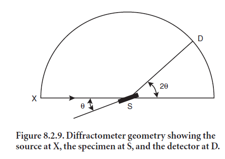 The Bragg-Bentano geometry, shown in Figure 8.2.9, is the most common for commercial diffractometers. The flat specimen rotates at an angle θ and the detector rotates at an angle 2θ with respect to the primary X-ray beam. This angle 2θ is widely used to describe the XRD peak angle. The X-ray tube, specimen, and detector all lie on the focusing circle, whose radius varies with angle, decreasing as 2θ increases from 0° to 180°. In addition the X-ray tube and the detector lie on the goniometer circle, whose center is at the center of the specimen, and the detector rotates around this circle. The specimen rotates about the same axis but at half the angular rate, so the surface of the specimen remains tangen-tial to the focusing circle.