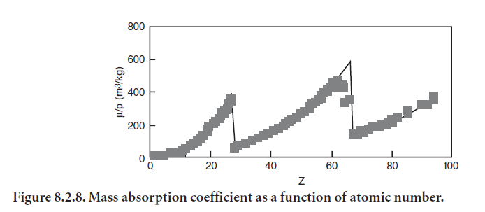The mass absorption coefficient depends on atomic number (and hence on the wavelength) as shown in Figure 8.2.8. There is a discontinuity at the critical energy at which its own inner shell electron is ejected.