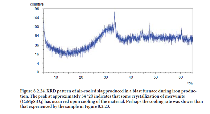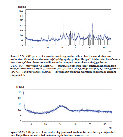 For the reasons mentioned above, XRD represents an invaluable technique to characterize fly ash for its glass vs. crystalline composition and therefore to identify potential applications. Fly ash with a higher calcium content, often found in Class C fly ash, results from burning subbituminous or lignite coals. Its crystalline phases include gehlenite, quartz, periclase, anhydrite, ferrite spinel, and merwinite. In some instances, tricalcium aluminate may also be present, which can cause imbal-ance in cement setting-control reactions. Figure 8.2.27 shows an example of a Class C fly ash.