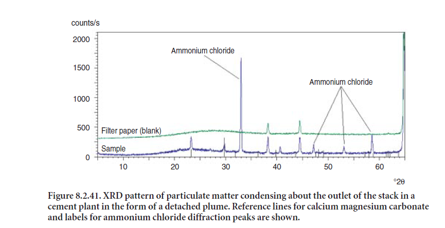 The major diffraction peaks in the detached plume belong to ammonium chloride (NH4Cl) and calcium magnesium carbonate (CaMg(CO3)2). Formation of NH4Cl can be attributed to postu-lated reactions involving NO2,HCl (mist), NH3 (gas), and H2O to occur in the formation of ammonium chloride (NH4Cl). Other products commonly found to form detached plumes include ammonium sulfate or sulfite, which can also precipitate as crystalline solid phases from the flue gas. Depending on the composition of the particulate matter, the particular mechanism of forma-tion of a plume may sometimes be elucidated in a relatively straightforward way with the help of XRD and other analytical techniques (including odor).
